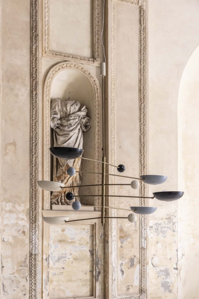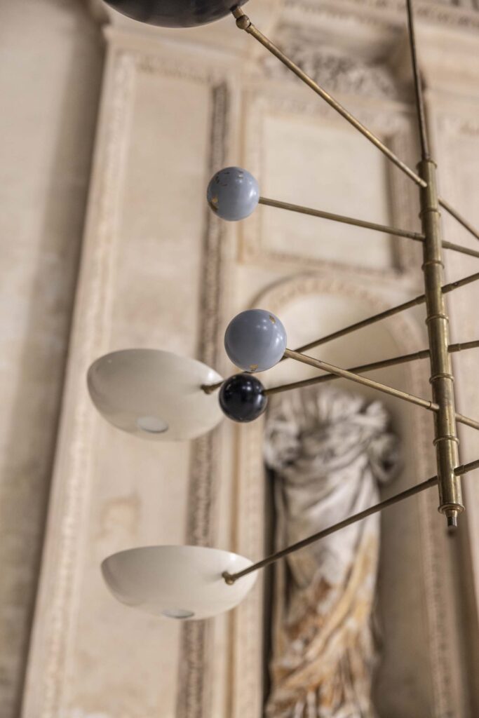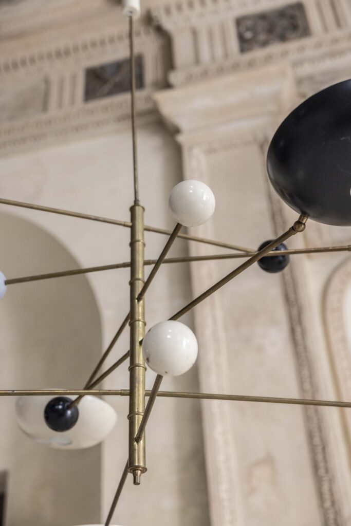Stilnovo chandelier made of gilded bronze with six rotating arms equipped with diffusers lacquered in shades of black, blue and white.