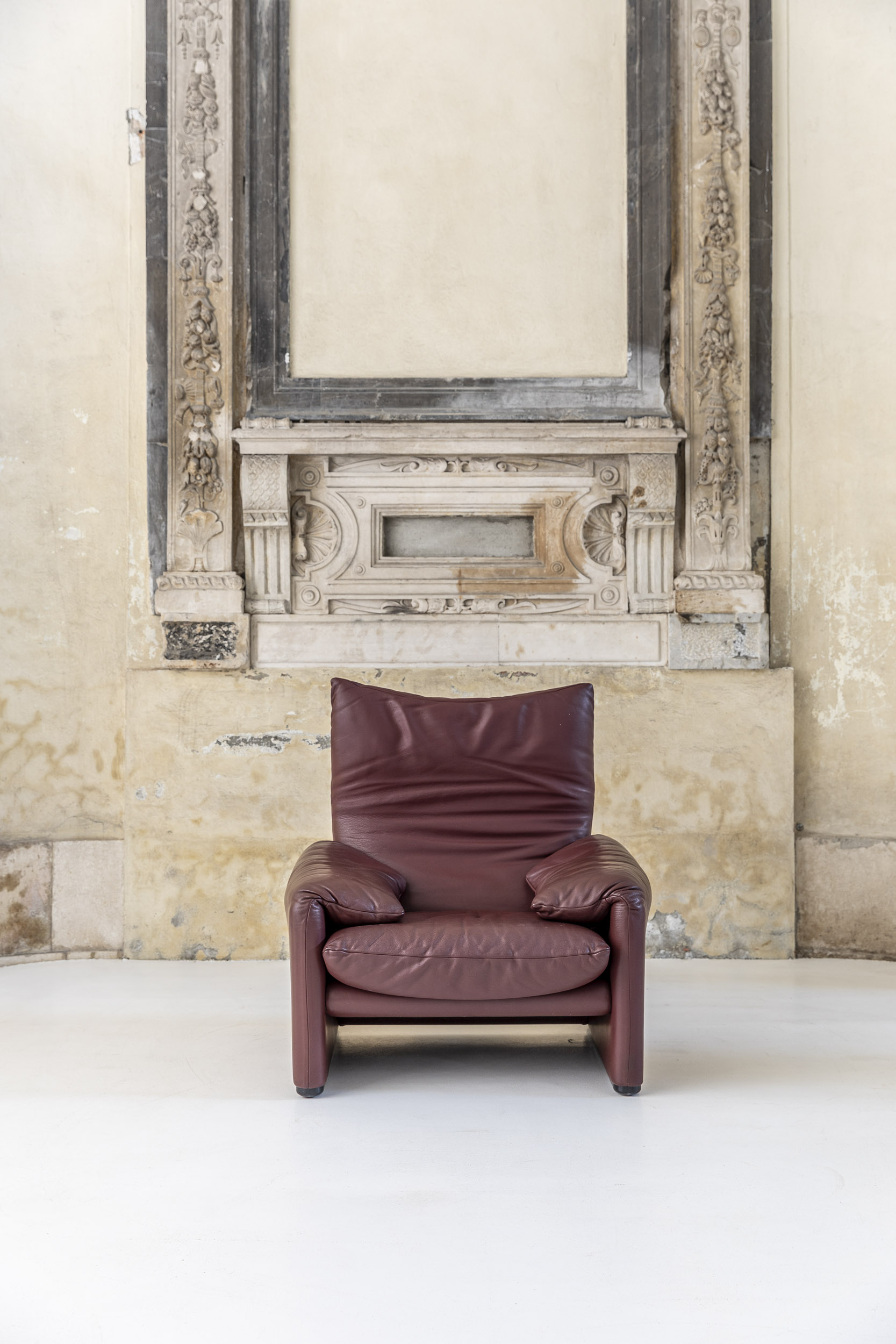 Maralunga is an emblematic sofa of Cassina, the work of architect and Industrial designer Vico Magistretti, designed in 1973. Winner of the Compasso d’Oro in 1979, Maralunga is the embodiment of the very idea of comfort, with an adjustable headrest for a high or low backrest version obtained by inserting a simple bicycle chain inside the foam of the backrest. This item features three-seat sofa and two armchairs.