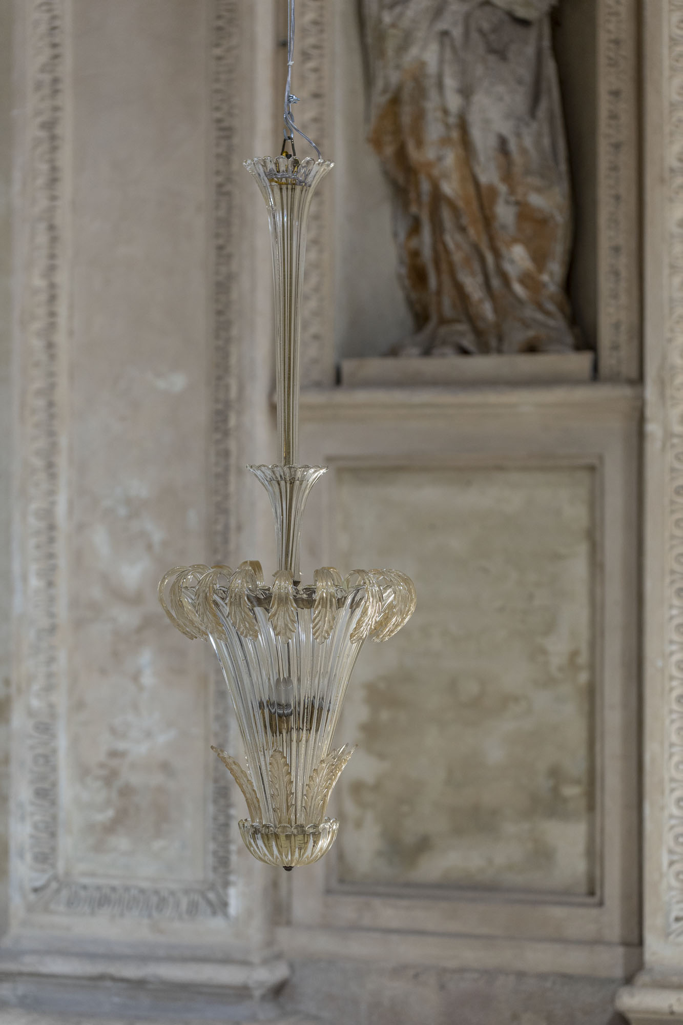 This chandelier is made of handblown Murano glass, made up of a central large cup with a leaves decoration in the tone of gold.