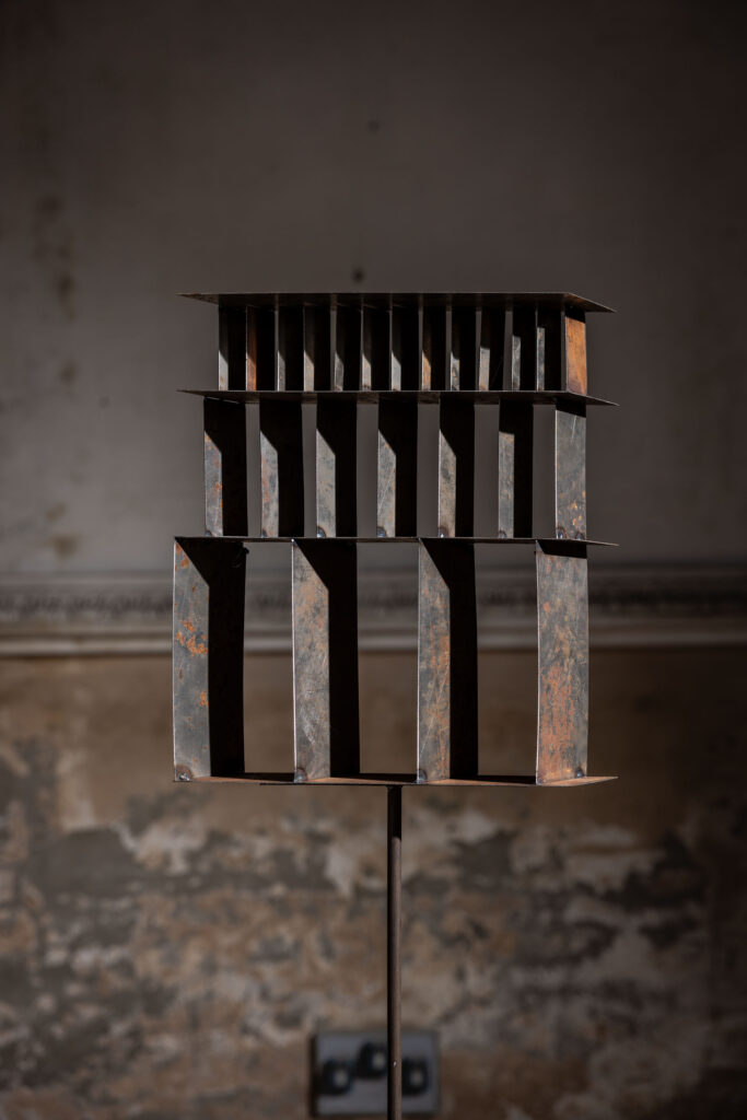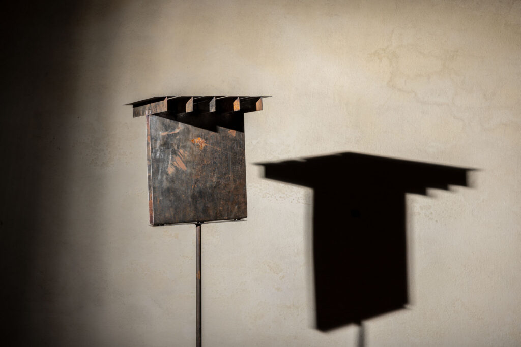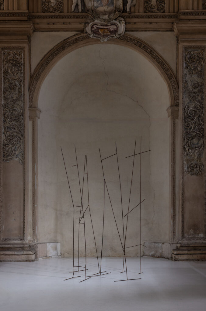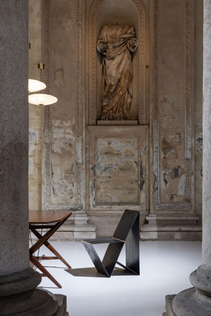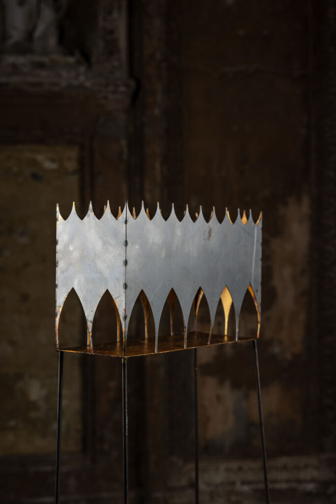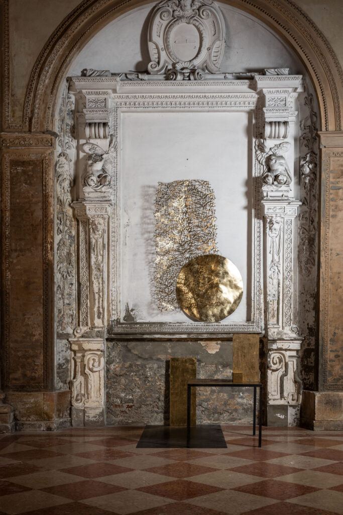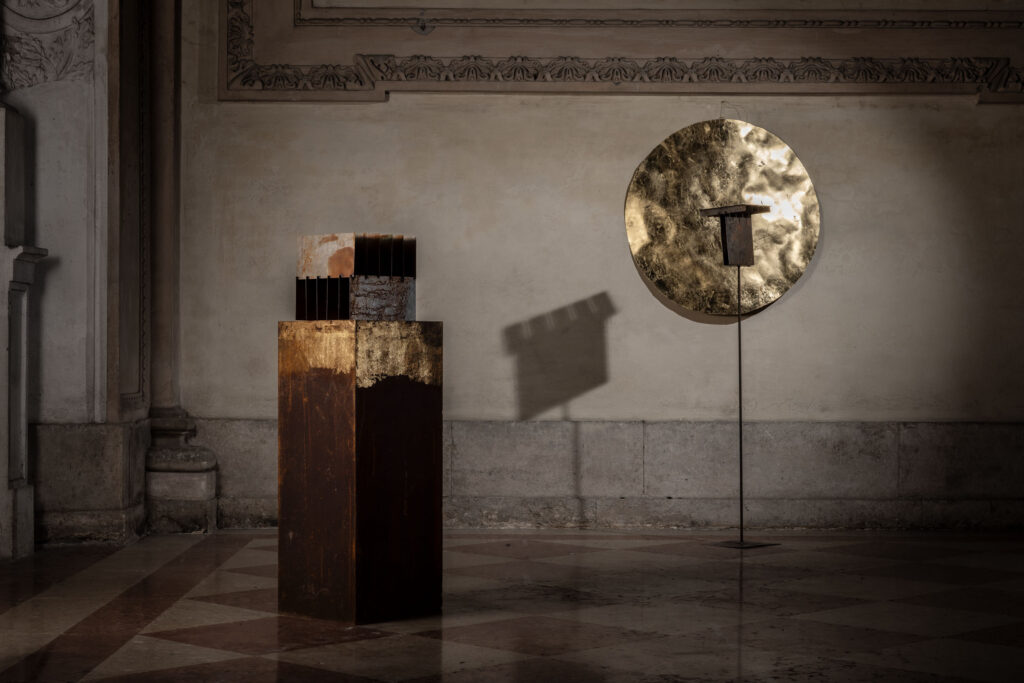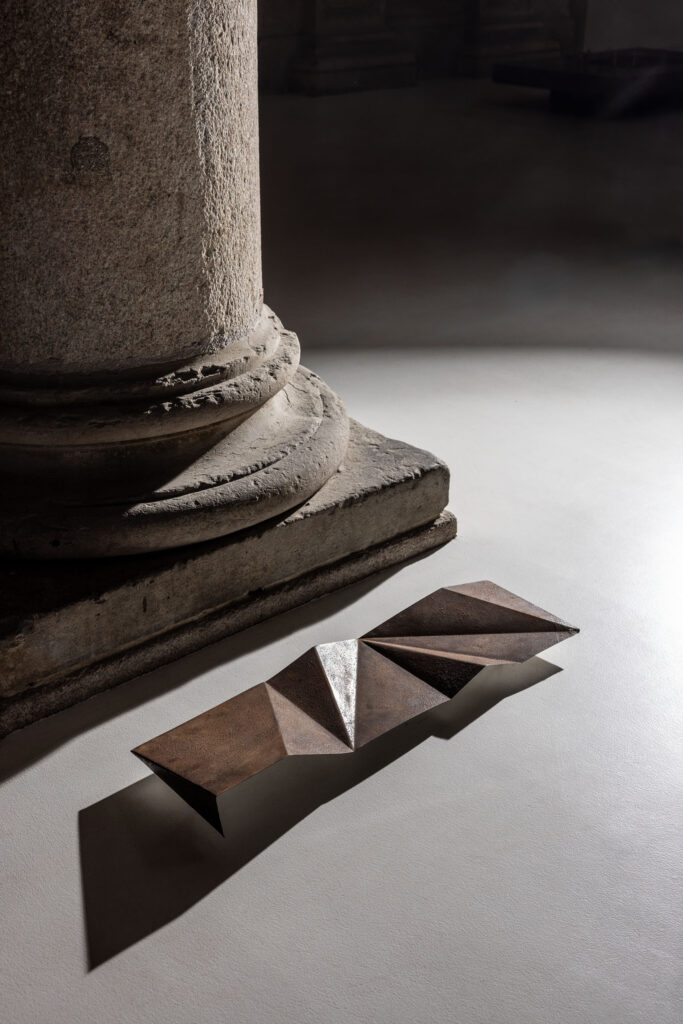 L’allestimento prevede una serie di opere d’arte disposte lungo le navate laterali e una grande installazione nella crociera sotto la cupola. Inoltre, una selezione di arredi e complementi unici è collocata nel coro, tra cui sedute, tavoli e altri oggetti di design pensati per l’abitare quotidiano, tutti modellati come pieghe di lamiera saldata, rifiniti con foglie di metallo e impreziositi da lamine di diverso colore.