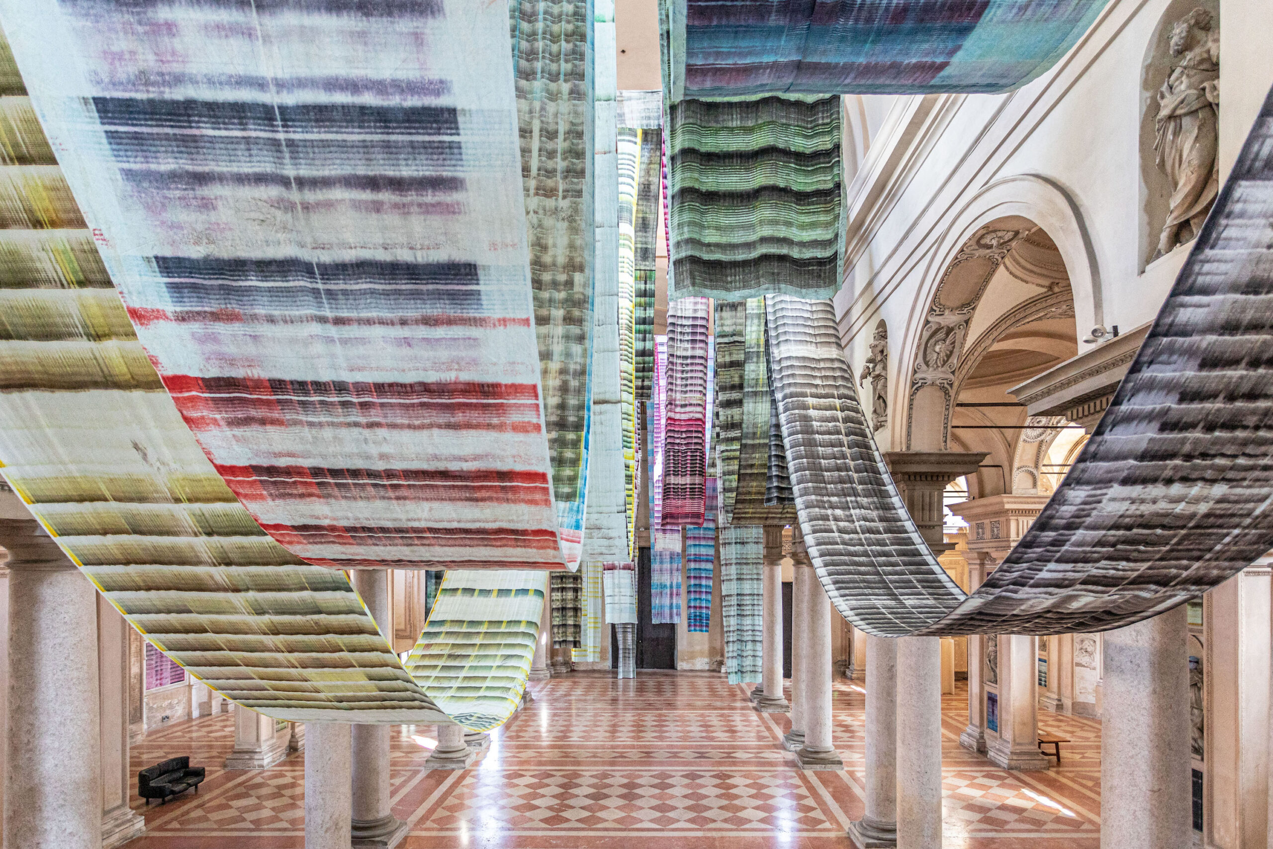 Colin ha dato vita a una mostra interamente pensata ad hoc per gli spazi della chiesa, presentando due nuovi cicli di lavori molto diversi sul piano della rappresentazione, ma uniti dall’uso degli stessi materiali e dallo stesso linguaggio dell’astrazione. Complessivamente si tratta di 60 tele, alcune anche di grandi dimensioni, più una monumentale installazione nella navata centrale della Chiesa. Da una parte, infatti, Gianluigi Colin ha decido di collocare le sue opere astratte (che ha chiamato “Impronte,” caratterizzate dal fatto di essere materiali di pulizia delle rotative di stampa di quotidiani o di libri) esattamente là dove prima c’erano le cinquecentesche pale d’altare: opere cariche di memorie di parole e di figure, qui dissolte in segni, striature dai colori tenui o accesi che suggeriscano un’idea di meditazione e riflessioni sulla fragilità dell’esistenza.