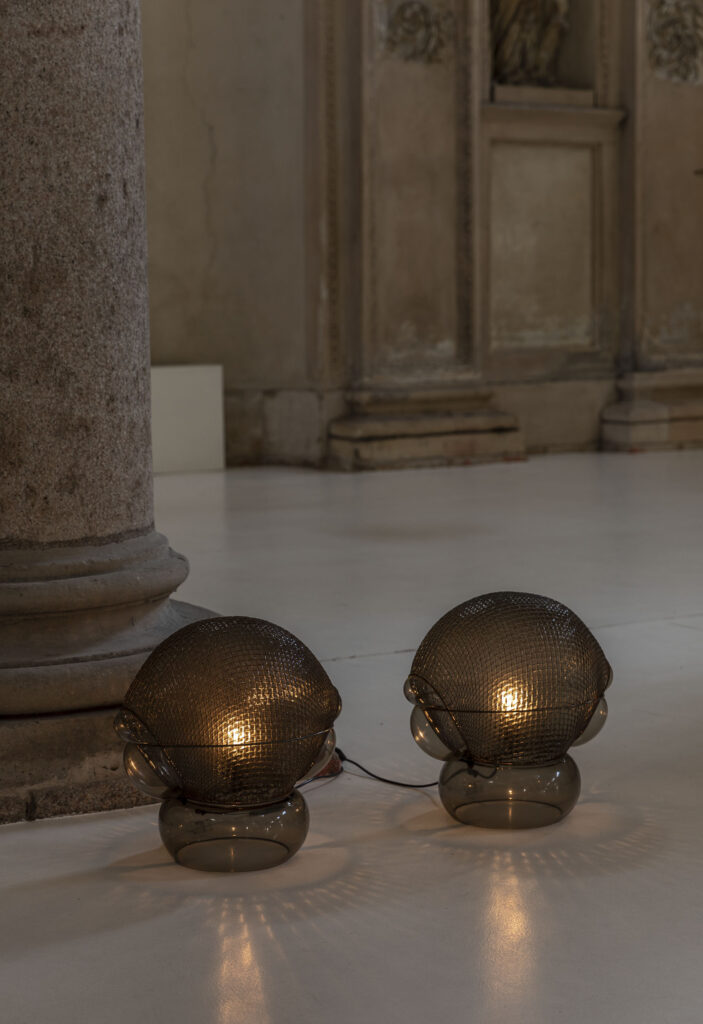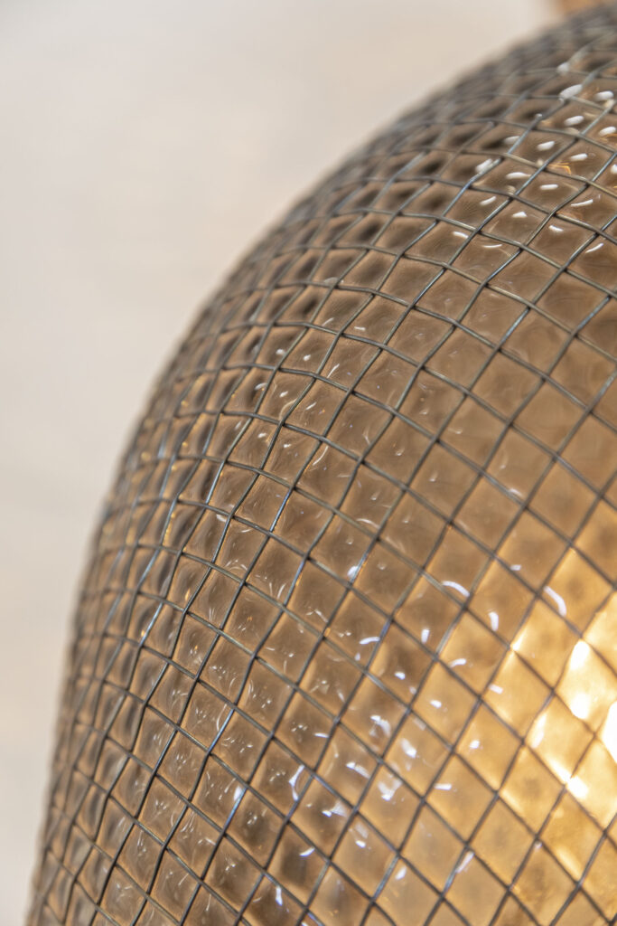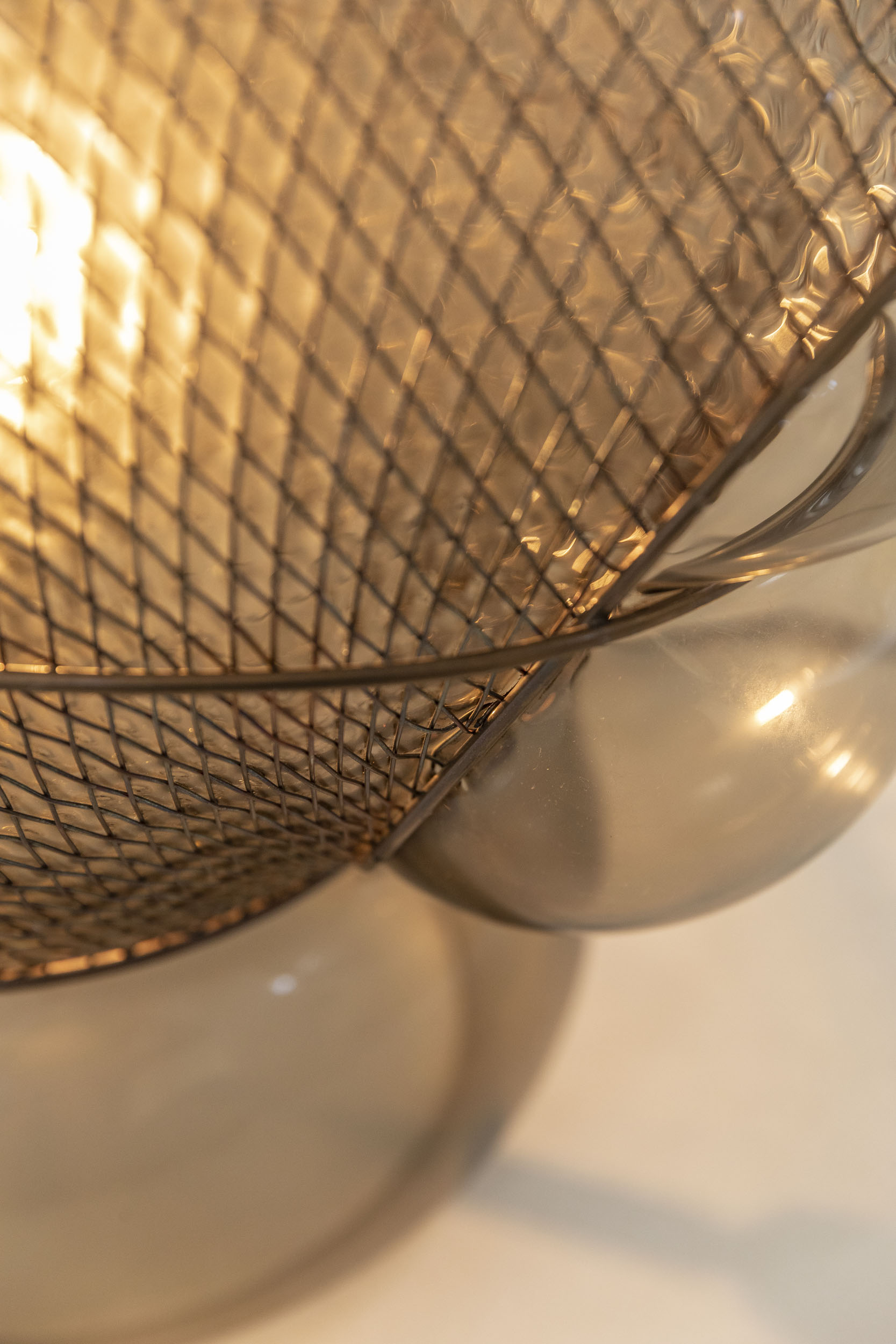 Il corpo delle lampade è in vetro nelle tonalità del marrone, la parte superiore è in parte coperta da una grigia romboidale in metallo.