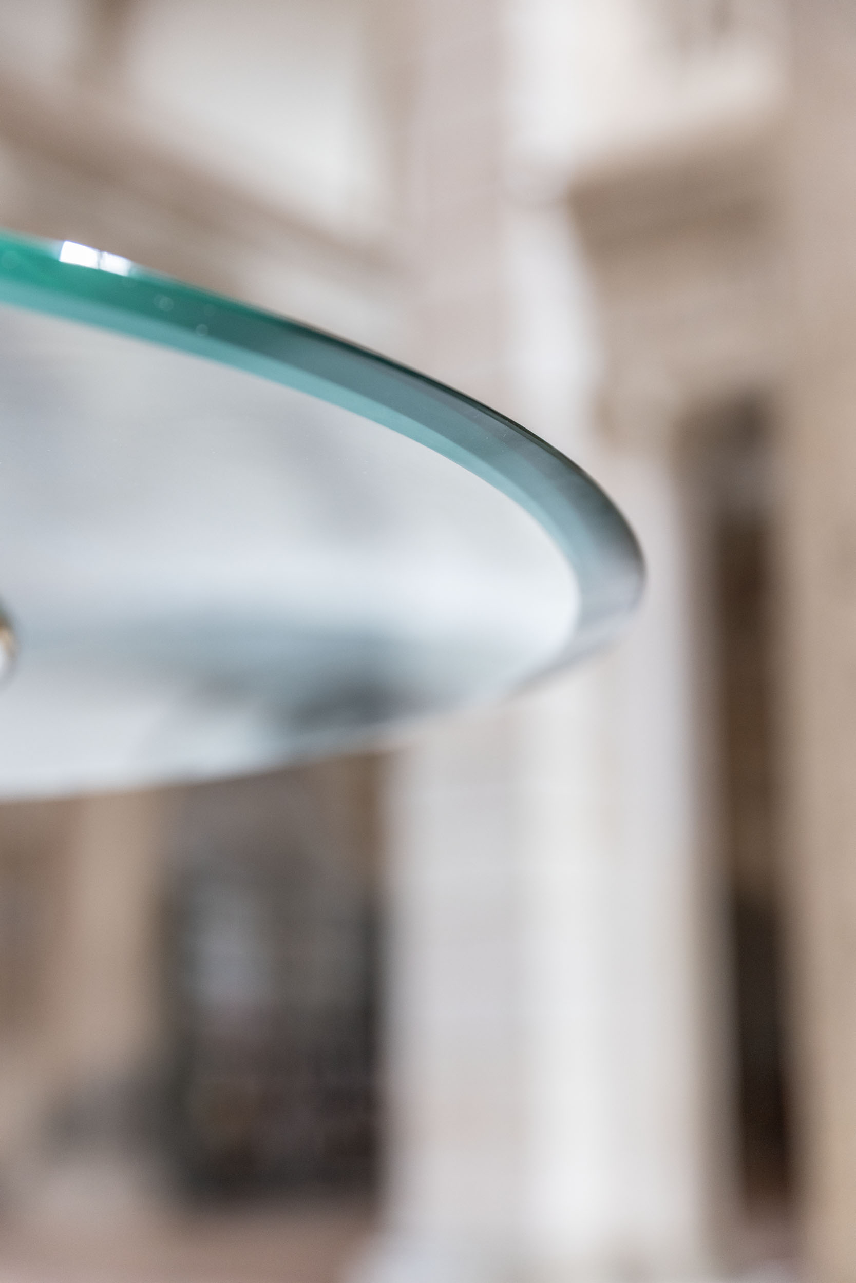Questa lampada a sospensione, prodotta da Fontana Arte, presenta un disco di vetro trasparente con dettagli in metallo e ottone
