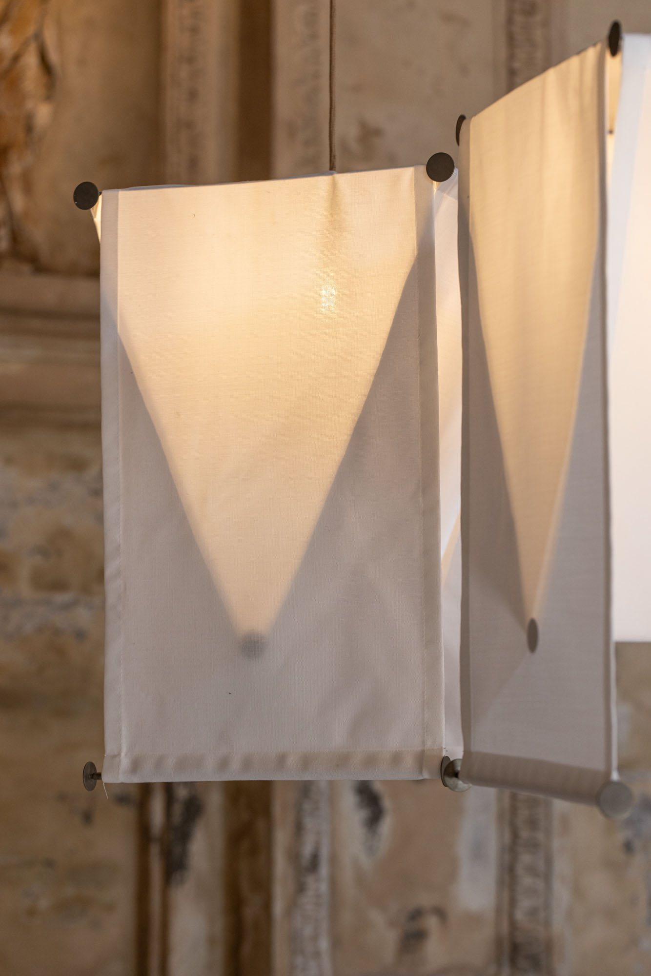 Le lampade Teli 347, di Achille e Pier Giacomo Castiglioni per Flos, presentano una struttura originale in metallo con tessuto rafano.