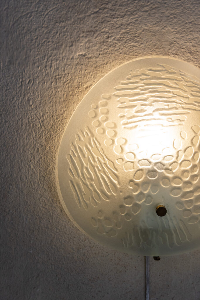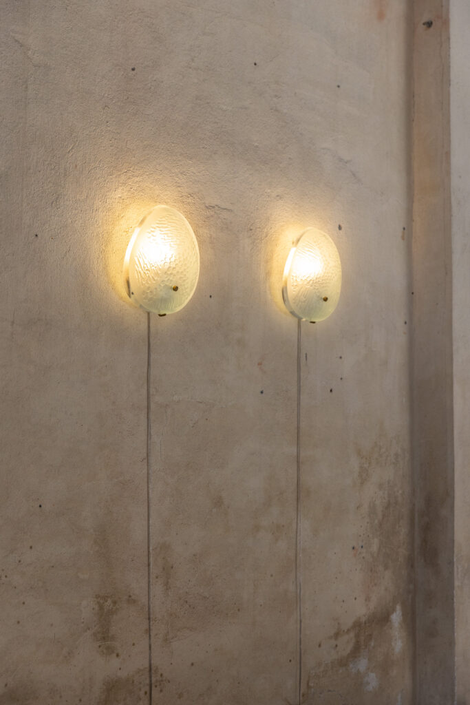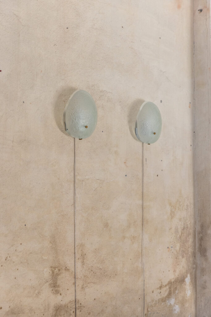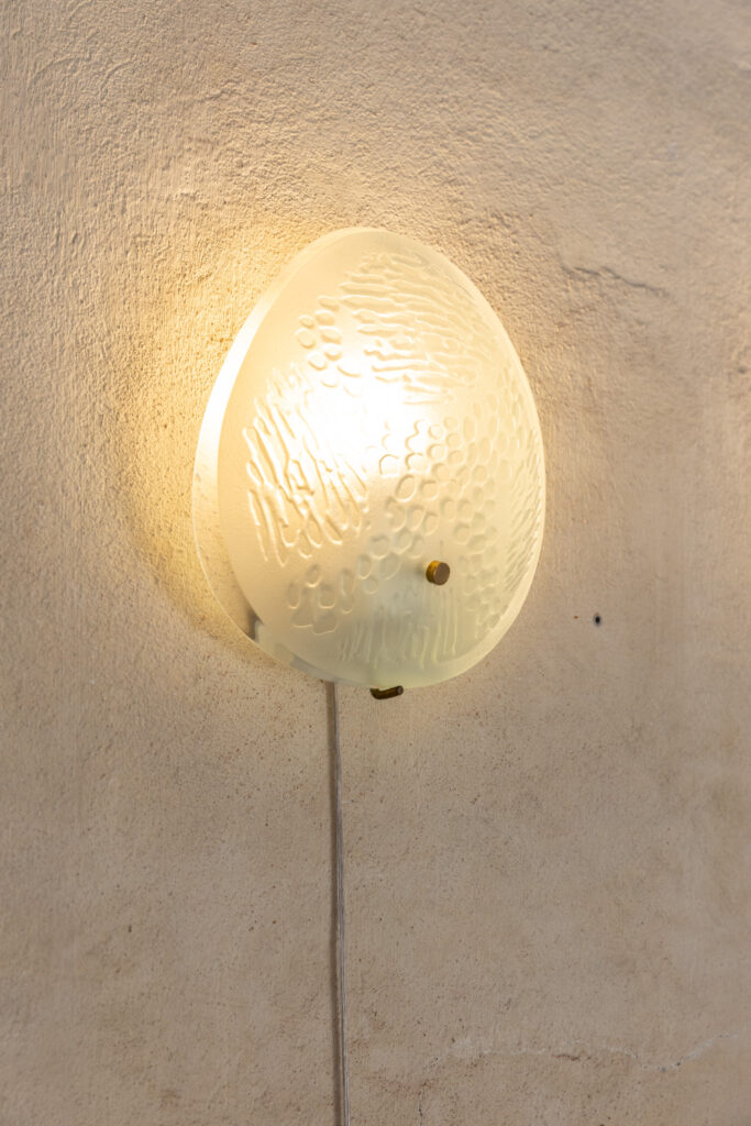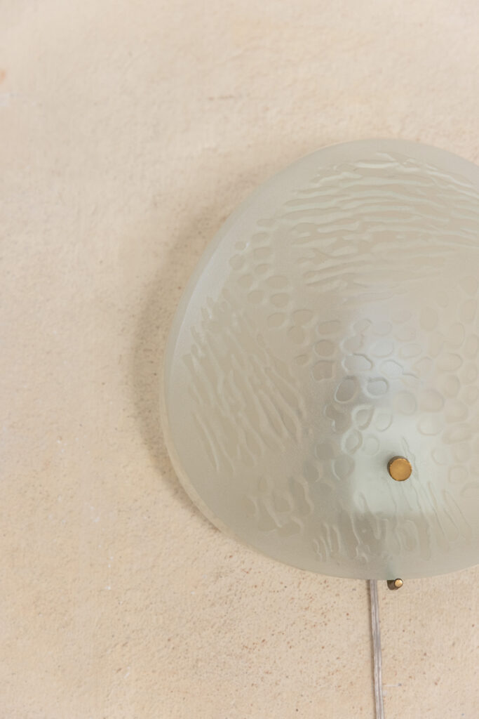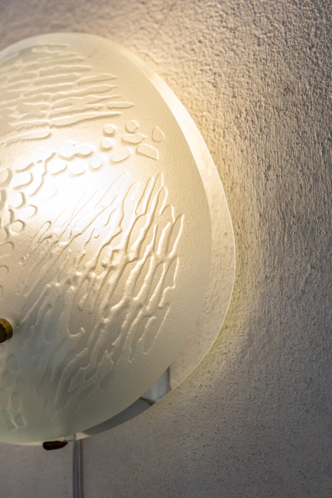 Coppia di lampade da parete modello 2199 disegnata da Max Ingrand per Fontana Arte.Realizzate in vetro acidato decorato con incisioni, ogni lampada è realizzata a mano.Bibliografia: I Quaderni di Fontana Arte n.4, pag.59.