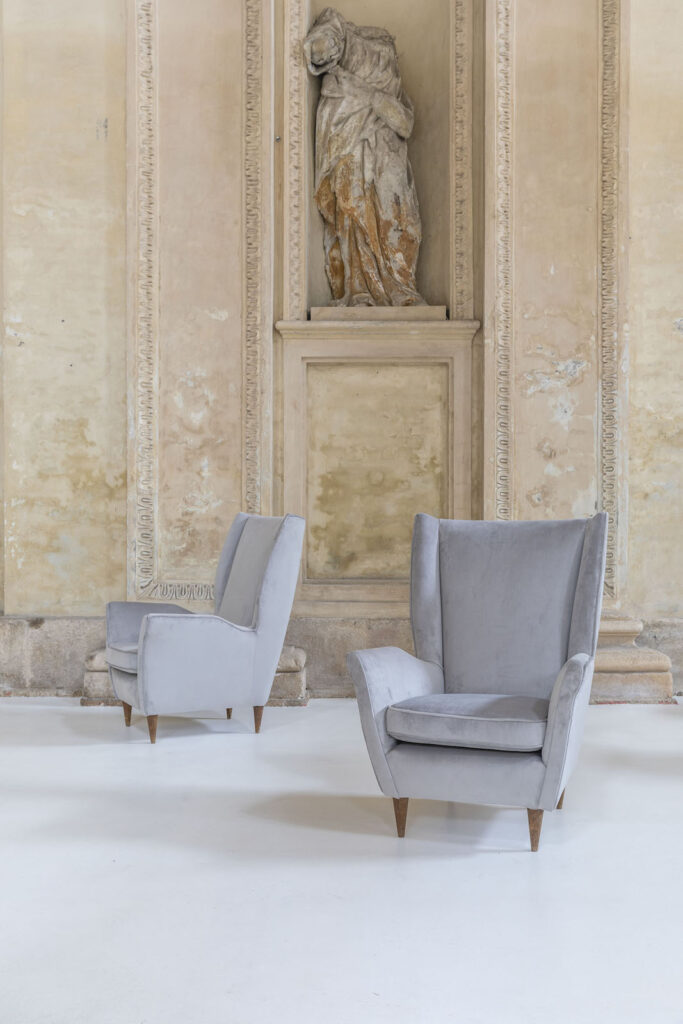 Poltrone in velluto grigio, attribuite a Gio Ponti per ISA.Gambe di legno originali, forma elegante e seduta comoda.Circa 1940A 103 cm x P 77 cm x L 72 cm