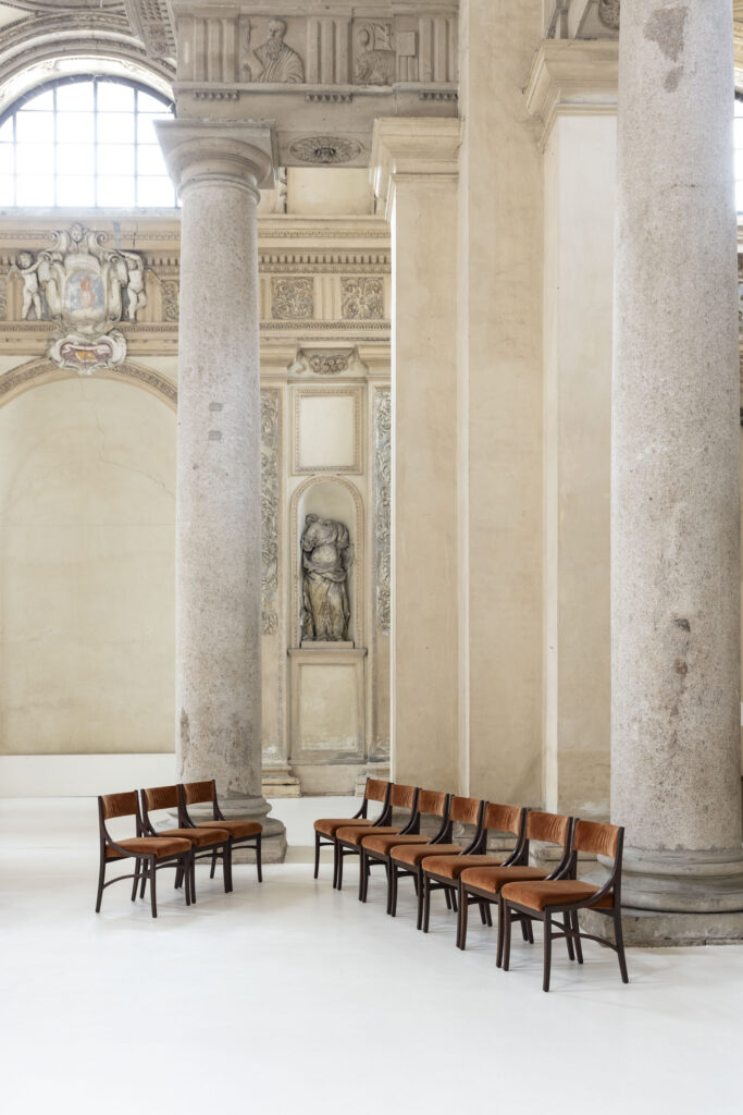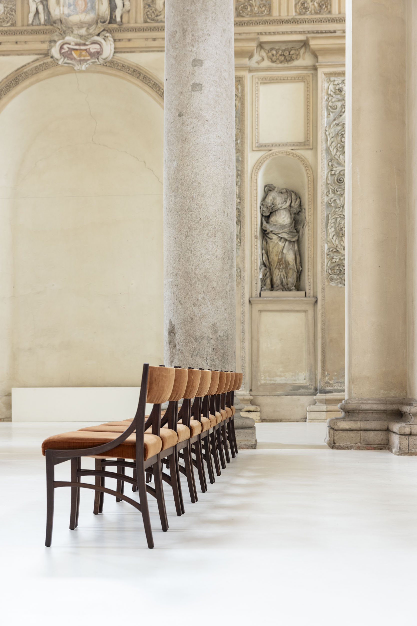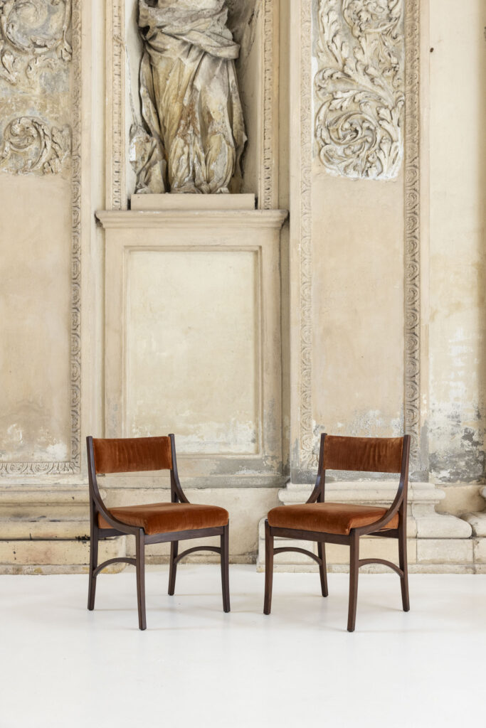 Set composto da 10 sedie da pranzo disegnate da Ico Parisi, modello 110, prodotte da Cassina nel 1961. Le sedie presentano una struttura in legno massello dalle linee morbide ed eleganti, unite al rivestimento in tessuto originale, a testimonianza della sensibilità materica e formale del design italiano di metà Novecento.