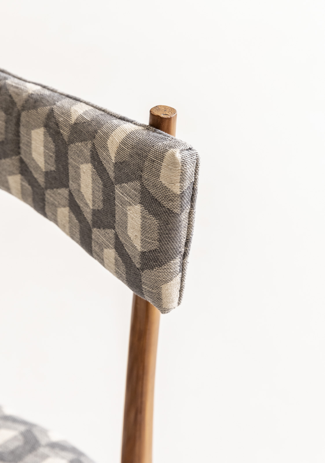 Set composto da sei sedie disegnate da Iconoclastie Parisi.struttura originale rivestita in cotone grigio, azzurro e bianco con trama anni ’50.