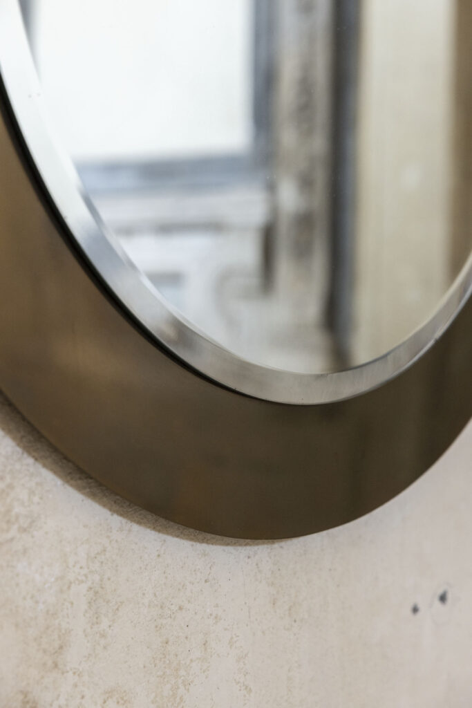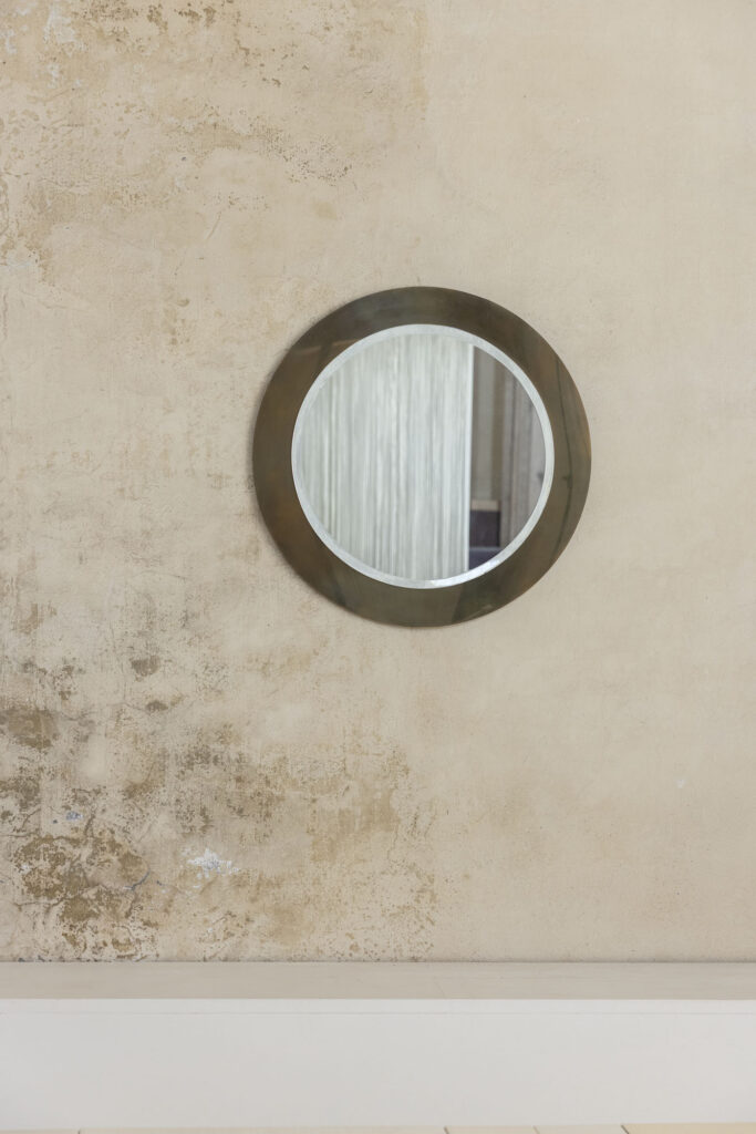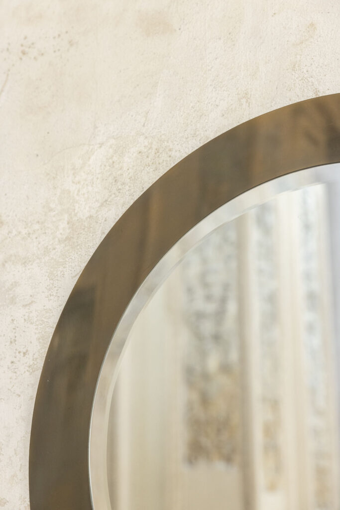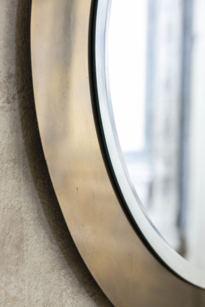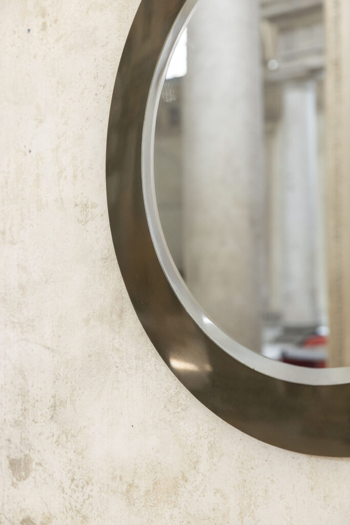Elegante specchio da parete rotondo con cornice e vetro originali, realizzato in Italia intorno al 1970.