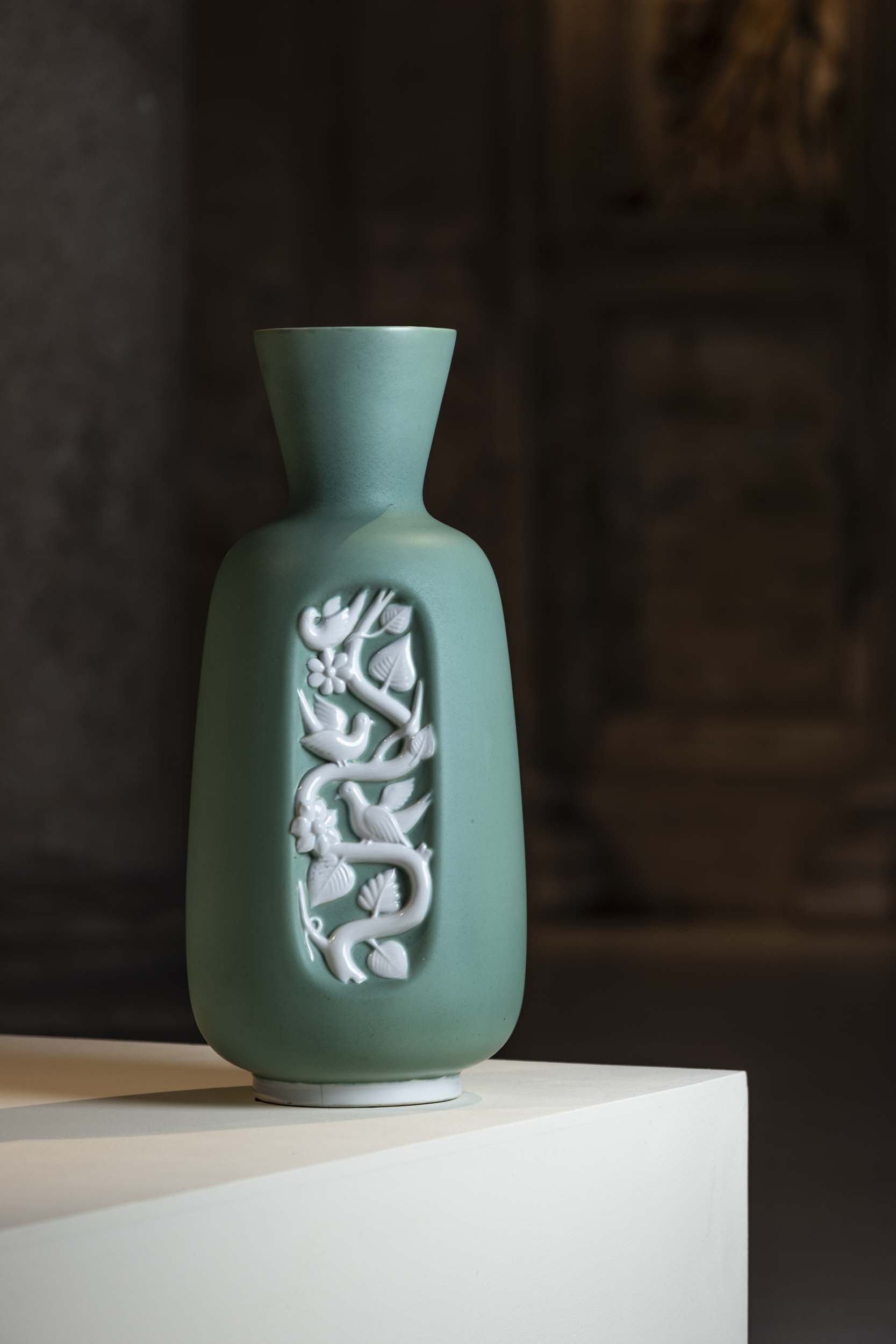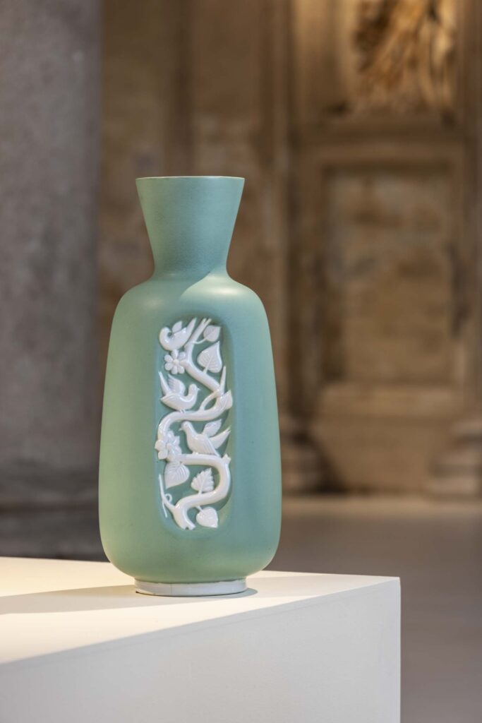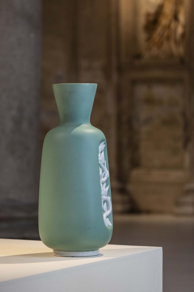 Vaso con decorazione floreale a bassorilievo, disegnato da Giovanni Gariboldi, manifattura Richard-Ginori, San Cristoforo, Milano, 1930–1935. Terracotta con smalto verde e bianco.
